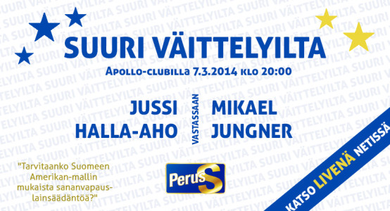 Kansanedustajat Jussi Halla-aho (ps.) ja Mikael Jungner (sd.) ottivat perjantaina Apollo-klubilla yhteen aiheesta ”Tarvitaanko Suomeen Amerikan-mallin mukaista sananvapauslainsäädäntöä?” Perussuomalainen verkkomedia lähetti tilaisuuden suorana verkkolähetyksenä. Väittelyn tallenne katsottavissa täällä > Lue lisää >
