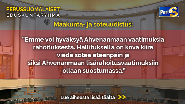 – Perussuomalaiset eivät voi tällaista ylikompensaatiota hyväksyä. Muutoin muutokset Ahvenanmaan itsehallintolakiin ovat tarpeellisia, mutta jätimme hallituksen lakiehdotukseen vastalauseen, jossa ehdotimme Ahvenanmaan rahoituksen tasoitusperusteeksi 0,42 prosenttia, joka on alkuperäinen ajatus korvata valtakunnan lainmuutoksesta johtuva menetys Ahvenanmaalle.