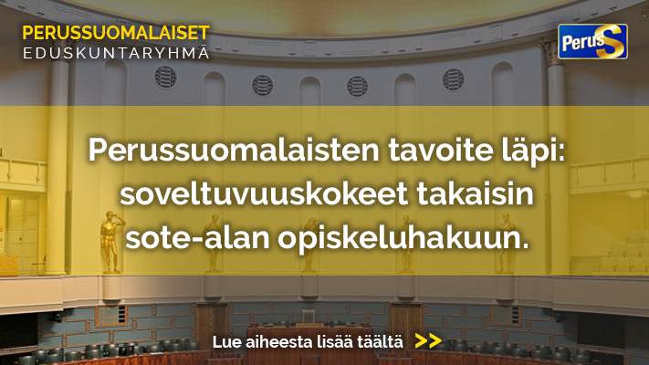 Opetus- ja kulttuuriministeriö on tänään tiedottanut, että sote-alan opintoihin hakevilta voidaan jatkossa vaatia soveltuvuuskoetta. Käytäntö on ollut ennenkin käytössä, mutta se poistui vuonna 2015. Perussuomalaisten kansanedustaja ja PS-Naisten puheenjohtaja Ritva ”Kike” Elomaa on erittäin tyytyväinen soveltuvuuskokeiden palauttamisesta.