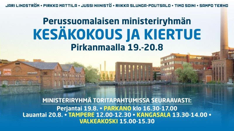 Perussuomalaisten ministeriryhmä kokoontuu kesäkokoukseensa Tampereelle 19.-20.8. Kokouksen yhteydessä järjestetään Pirkanmaalla ministerikiertue. Ministeriryhmä vierailee toritapahtumissa seuraavasti: