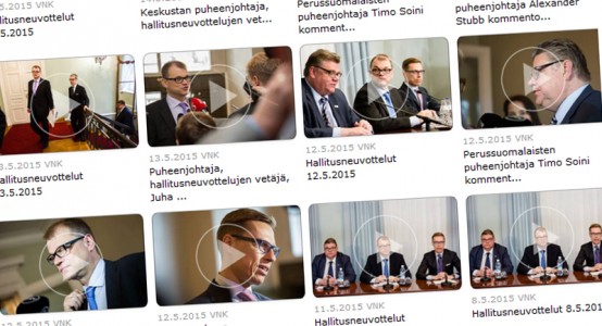 Perussuomalaiset, kokoomus ja keskusta aloittivat hallitusneuvottelut 8.5. Neuvottelujen ensimmäinen tiedotustilaisuus pidettiin valtioneuvoston juhlahuoneistossa Smolnassa. Tiedotustilaisuuksia voi seurata verkossa valtioneuvoston sivuilla: Videotallenteet tiedotustilaisuuksista > Valokuvia neuvottelujen etenemisestä (Flickr-kuvapalvelu) > Lue lisää >
