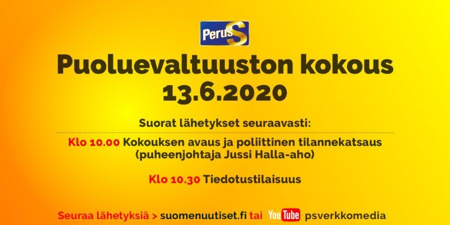 Perussuomalaisten puoluevaltuuston kokous järjestetään Helsingissä lauantaina 13.6.2020 klo 10 alkaen.