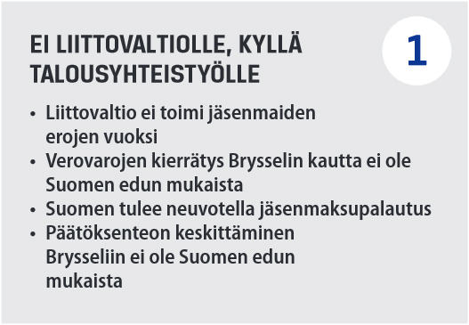 EU:sta on rakennettu liittovaltiota pienin askelin. Jäsenmaiden itsenäisyyttä ja riippumattomuutta on nakerrettu pala palalta. Ennen talouskriisiä tämä kielteinen kehitys eteni lähes huomaamatta, mutta euron pelastamisen nimissä yhdentymisen vauhtia on kiihdytetty. Liittovaltion rakentaminen ilman kansalaisten selkeää kansanäänestyksessä annettua tukea ei ole oikea eikä hyväksyttävä menettely. Lue lisää >