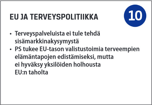 Terveydenhuolto on perussuomalaisten mielestä kansallinen asia, eikä terveyspalveluista pidä tehdä sisämarkkinakysymystä. Muiden Euroopan unionin jäsenmaiden käytännöt eivät terveyspalveluiden osalta sovi harvaan asuttuun Suomeen. Mahdollisiin terveydenhoitopalveluja koskeviin sisämarkkinasäädöksiin on tarvittaessa haettava kansallisia poikkeuksia. Perussuomalaiset kannattavat Nizzan sopimusta (2003) siltä osin, kun siinä päätettiin jättää sosiaali- ja terveyspalveluiden kauppa yhteisön jakamattoman toimivallan ulkopuolelle. Lue lisää >