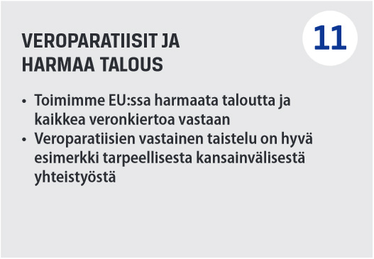 EU:n keskeisimpiä painopisteitä tulee olla veroparatiisien bisnesetiikan palauttaminen kestävälle pohjalle. Perussuomalaiset näkevät tämän esimerkkinä tavoitteesta, johon nimenomaisesti tarvitaan kansainvälistä yhteistyötä ja jossa EU voi siten olla hyödyllinen. Lue lisää >