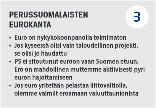 Eurokriisi on karulla tavalla osoittanut euron ongelmat. Omasta valuutasta ja rahapolitiikasta luopuminen on useimmille euromaille ollut paljon suurempi menetys kuin euron usein epäselvät hyödyt. Euro on jäsenmaiden nykykokoonpanolla toimimaton valuutta, joten nykyisen kaltaisia kriisejä tultaneen kohtaamaan tulevaisuudessakin. Eurojärjestelmään viime vuosina tehdyt korjausyritykset ovat joissakin tapauksissa jopa pahentaneet tilannetta. Erityisesti tukipakettipolitiikka on yhtä moraalitonta kuin epäonnistunuttakin. Lue lisää >