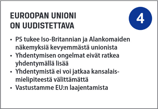 Perussuomalaiset on kansainvälisesti verkostoitunut puolue, joka arvostaa ja kunnioittaa Eurooppaa. On siksi tärkeää kysyä, tekeekö nykymuotoinen Euroopan unioni Euroopan paremmaksi paikaksi kansalaiselle elää tai yritysmaailmalle toimia? EU ei omista Euroopan ideaa, eikä EU:n kritisointi ole kansainvälisyyden tai eurooppalaisuuden vastustamista. Lue lisää >