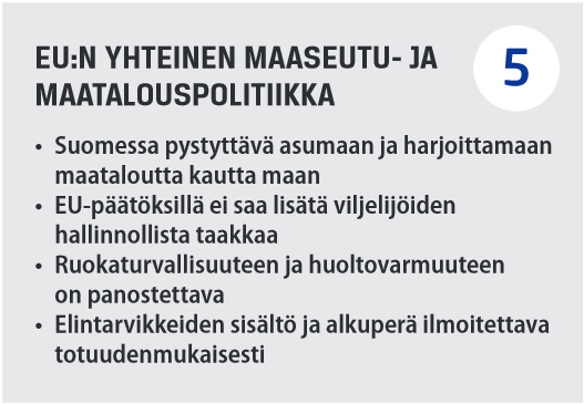 Perussuomalaiset haluavat nähdä Suomen maaseudun sekä elinvoimaisena että monimuotoisena myös tulevaisuudessa. Maaseutu on maamme turva ja voimavara. Suomalainen arvostaa maaseutua sekä puhdasta, kotimaista ruokaa. Siksi puhdas suomalainen luonto ja maataloustuotanto on turvattava. Lue lisää >