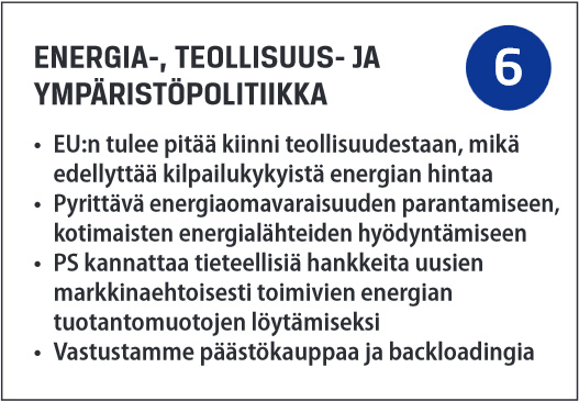 EU:n tulee kaikin keinoin pitää kiinni teollisuutensa kilpailukyvystä. EU-maat tarvitsevat teollisuuden työpaikkoja noustakseen talouskriisistä ja turvatakseen hyvinvointinsa. Kilpailukykyinen teollisuus edellyttää kilpailukykyistä energian hintaa. EU:n on myös pyrittävä kohottamaan energiaomavaraisuuttaan. Perussuomalaiset tukevat EU:n tieteellisiä hankkeita uusien markkinaehtoisesti toimivien energian tuotantomuotojen löytämiseksi. Puollamme myös kotimaisten energialähteidemme hyödyntämistä. Lue lisää >