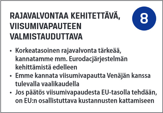Perussuomalaiset näkevät rajavalvonnan olevan keskeinen osa yhteiskunnan ja kansalaisten turvallisuutta. EU:n on varmistettava korkeatasoisen rajavalvonnan säilyminen kaikilla unionin ulkorajoilla. Turvapaikkaväärinkäytösten estämiseen luotua Eurodac-sormenjälkitiedostojen vertailujärjestelmää on edelleen kehitettävä. Eurodac-järjestelmä paljastaa, jos sama henkilö on hakenut turvapaikkaa monesta maasta. Ohjelman avulla EU:n jäsenvaltiot voivat selvittää, ovatko jossakin EU-maassa laittomasti oleskelevat henkilöt hakeneet turvapaikkaa EU:n alueelta. Lue lisää >