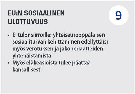 EU:lta odotetaan aika ajoin perusteetta, että se kykenisi ratkaisemaan jäsenmaiden sosiaaliset ongelmat. Unionilla ei ole varoja eikä edellytyksiä kehittää itselleen käytännöllistä sosiaalista ulottuvuutta. EU:n budjetti on 150,9 miljardia euroa (2013), eikä sitä tule kasvattaa. Mielekkään yhteiseurooppalaisen sosiaaliturvan kehittäminen edellyttäisi myös verotuksen yhtenäistämistä. Tämä on käytännössä mahdotonta. Lisäksi useimpien muiden jäsenmaiden sosiaaliturvan käytännöt ovat perustavalla tavalla poikkeavia suomalaisista. Näiden järjestelmien yhteensovittaminen ei onnistu toimivasti. Lue lisää >
