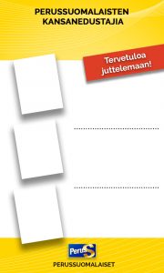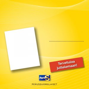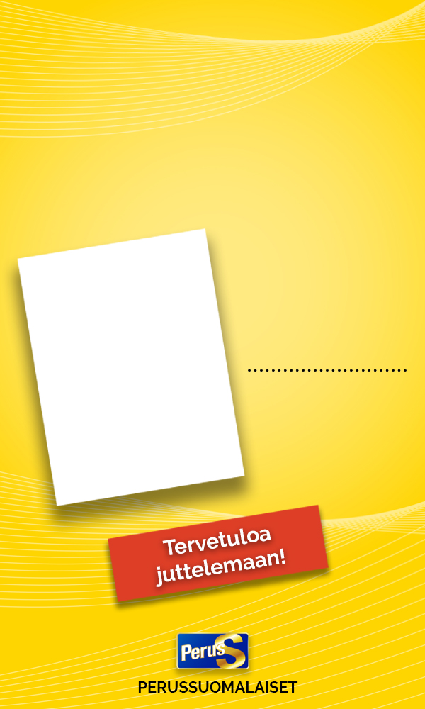 Tältä sivulta löydät perussuomalaisten valmiita tapahtumailmoituspohjia käyttöösi koossa 800×800 ja 600×1000. Jos sinulla on kysyttävää kuvapohjien käytöstä ota yhteyttä tuki@perussuomalaiset.fi sähköpostiin tai tai puhelimitse arkisin: 040 661 6919 .