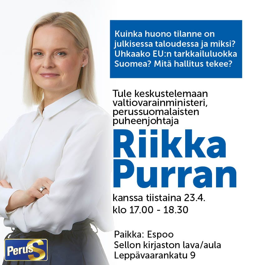 Tule keskustelemaan valtiovarainministeri Riikka Purran kanssa tiistaina 23.4.2024 klo 17:00-18:30 Sellon Kirjastoon, Leppävaarankatu 9.