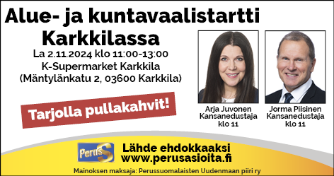 Tervetuloa Perussuomalaisten alue- ja kuntavaalistarttiin Karkkilassa lauantaina 2.11.2024 klo 11-13 K-Supermarket Karkkilan pihalla, Mäntylänkatu 2, Karkkila.