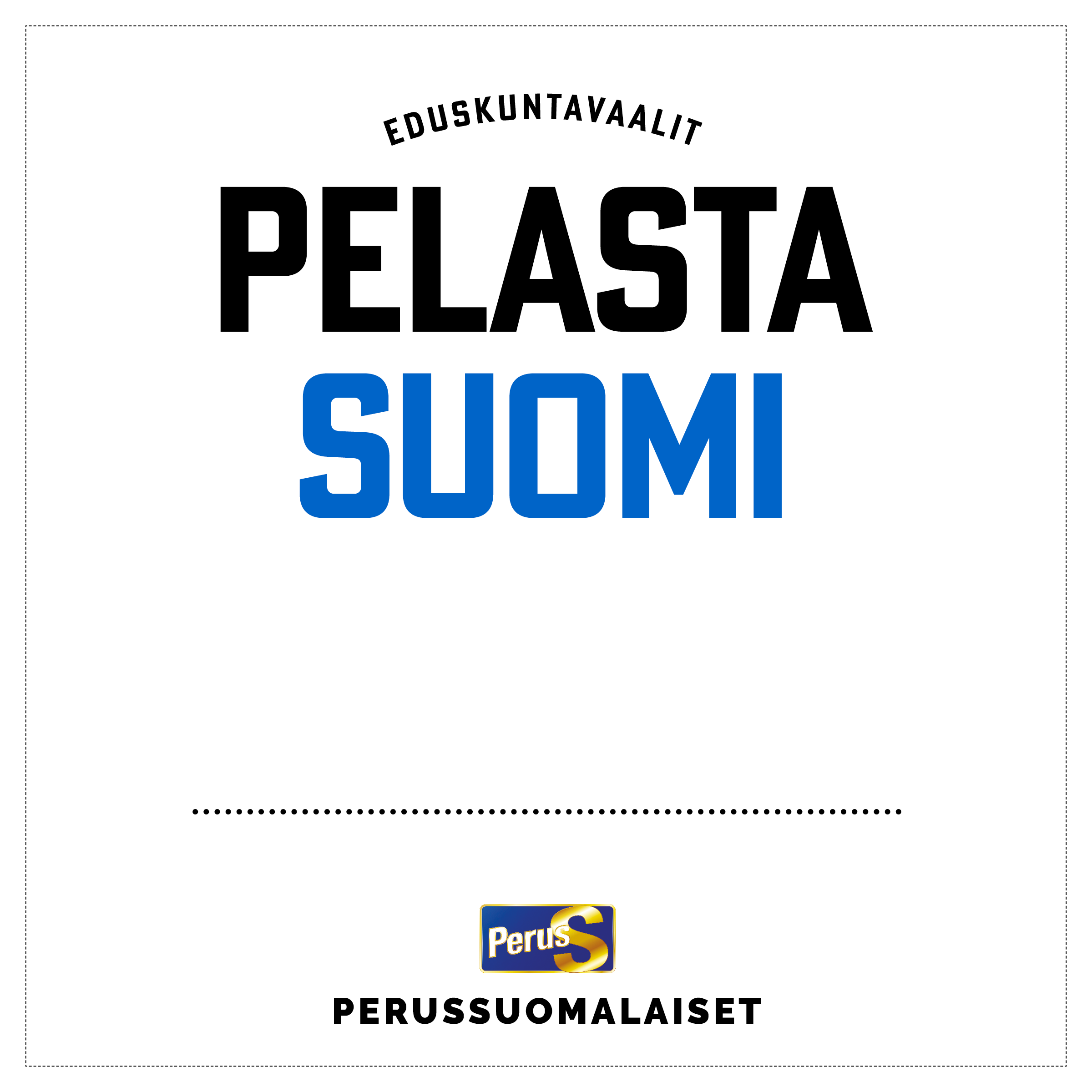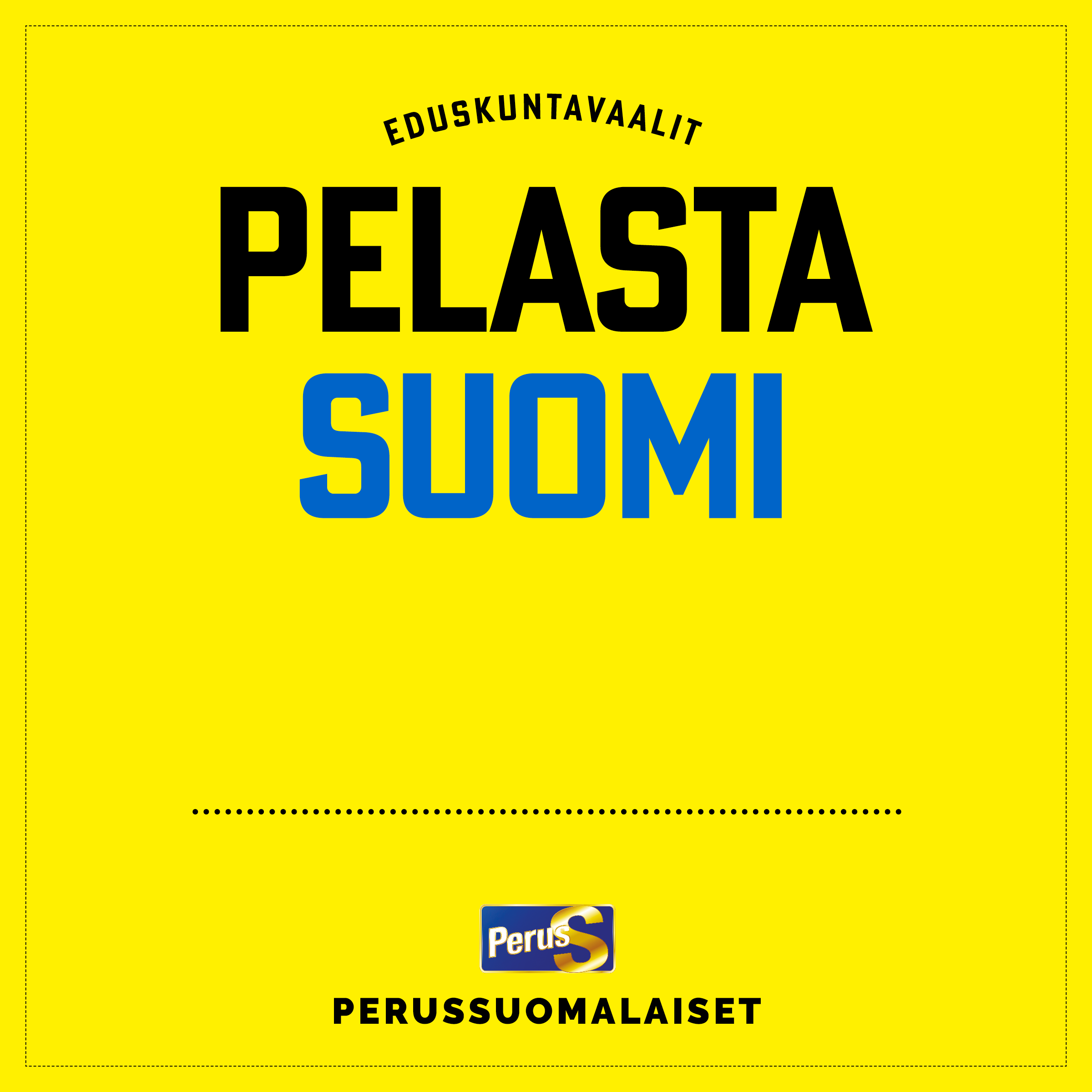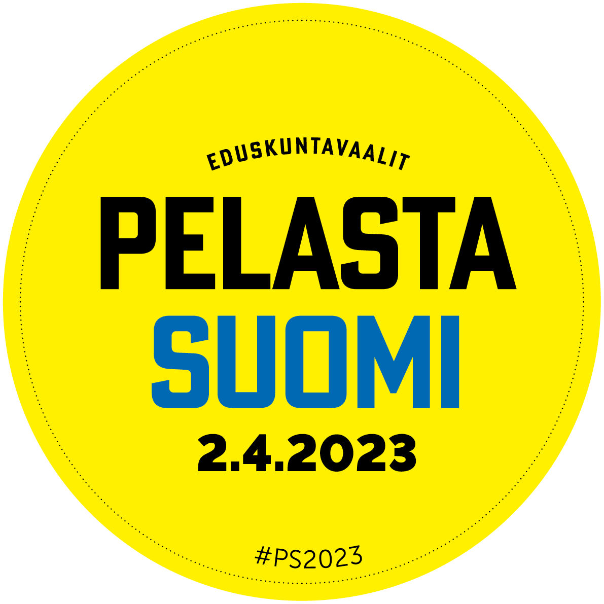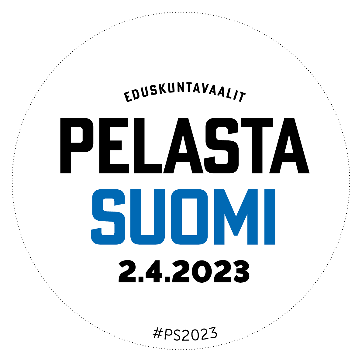 Perussuomalaisten eduskuntavaalien graafinen ulkoasu muodostuu kahdesta eri elementistä: pyöreästä pallosta ja kampanjatekstistä PELASTA SUOMI.